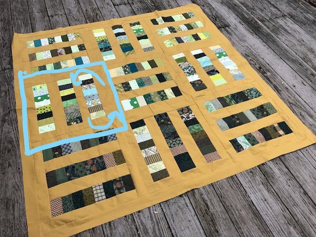 There are four gold vertical strips in each block. The middle two are wider than the outer two. It's hardly noticeable (which explains why I didn't notice it) but if I quilted the way I wanted to, it would be VERY noticeable.